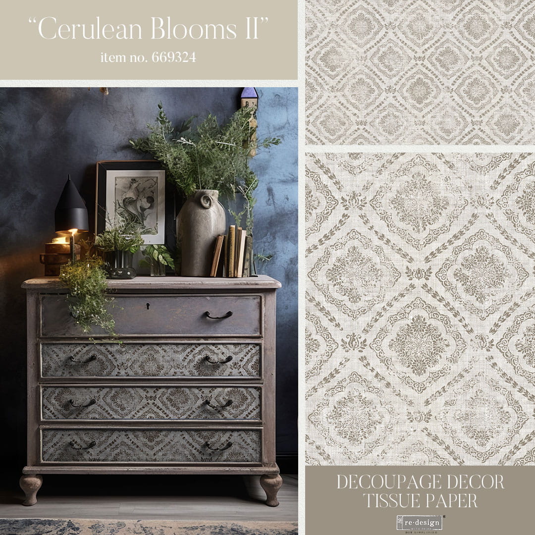 Zmień swoje wnętrze i projekty używając papier decoupage Cerulean Blues II od Prima Redesigns .
