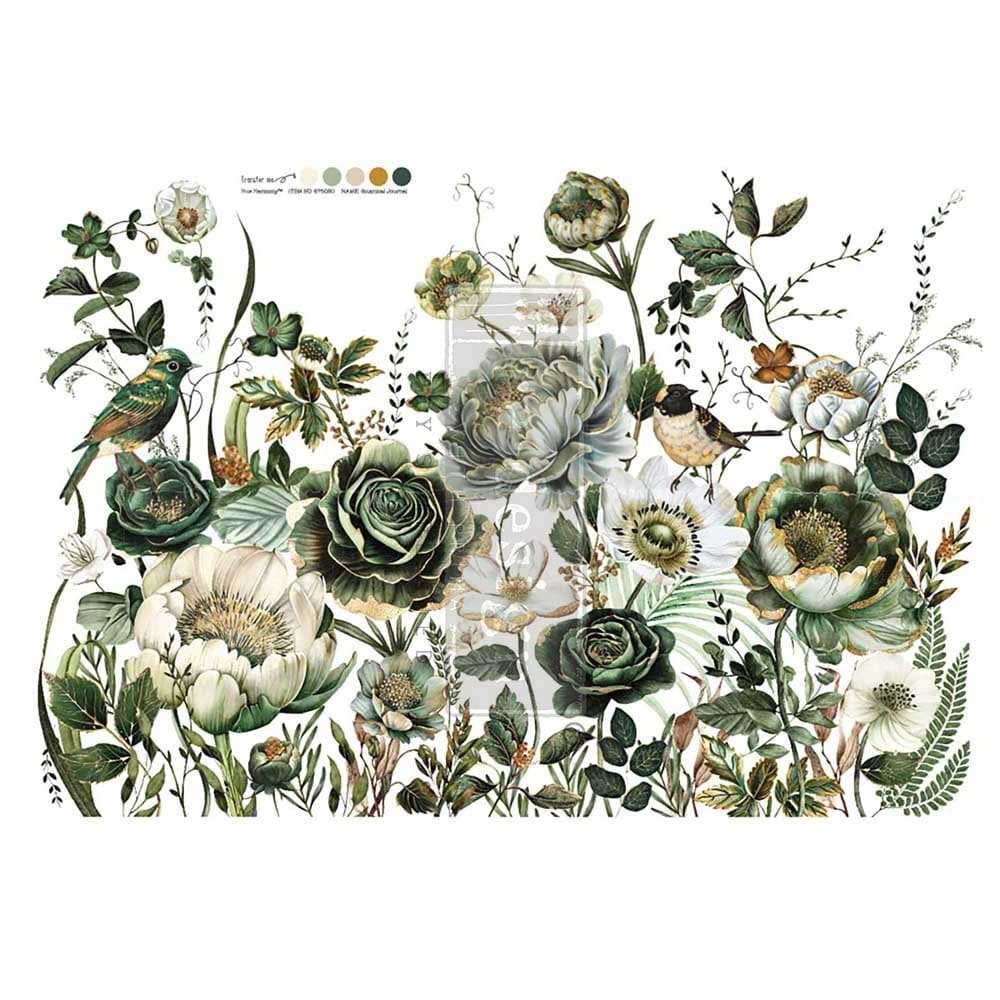Duży transfer Botanical Journal Redesign . Rozmiar arkusza w calach to 24 cale x 35cali celowo podzielony na 4 arkusze ułatwi pracę. Wprowadź piękno natury do swoich dzieł dzięki Botanical Journal Decor Transfers®. Ten oszałamiający transfer ma bujny układ kwiatów, delikatną zieleń i boskie kolory.
